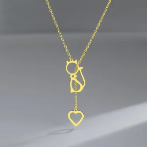 Collier ras de cou coulissant avec pendentif chat et cœur en acier inoxydable