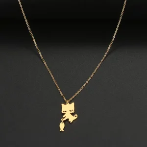 Collier en acier inoxydable doré ou argenté avec chaton mignon qui attrape un petit poisson