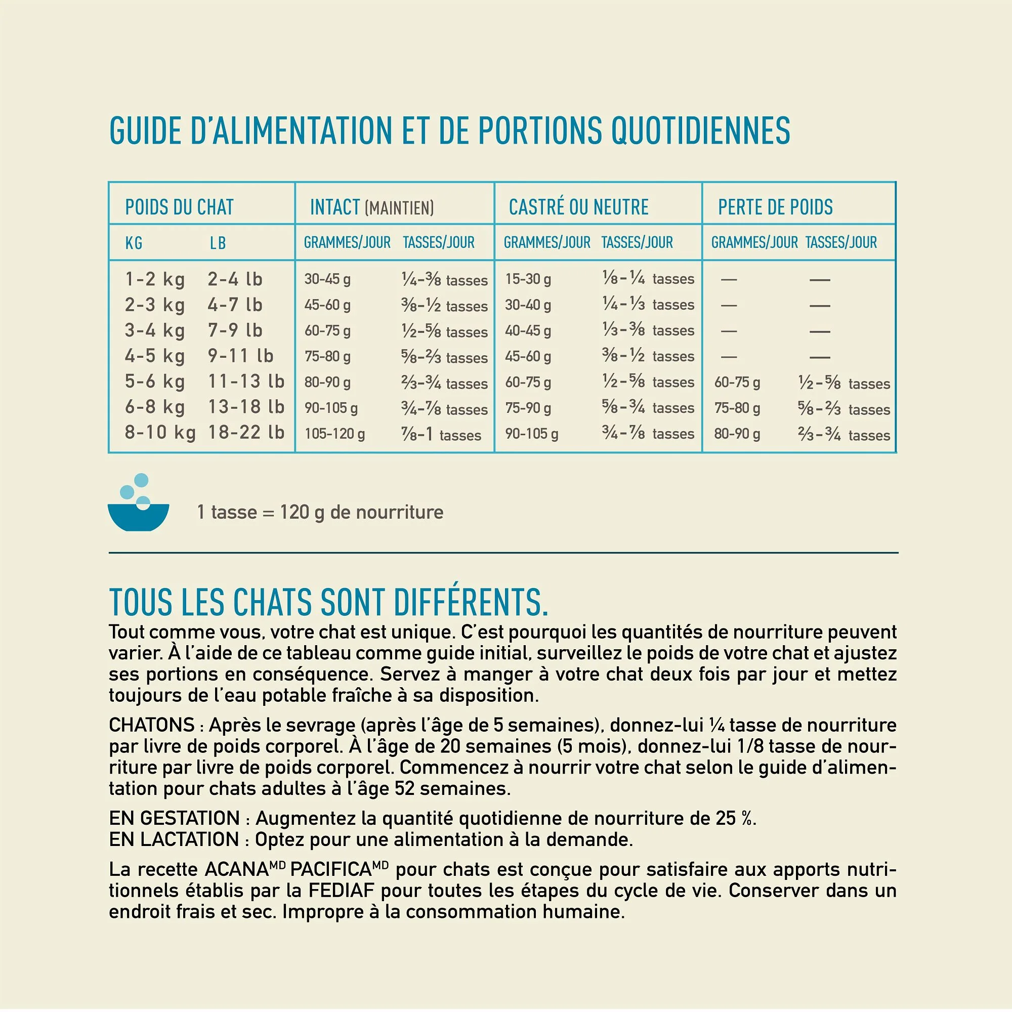 Énergie métabolisable: 3930 kcal/kg (472 kcal pour une tasse de 250ml/120g cup), avec 38 % provenant des protéines, 23 % provenant des fruits et légumes et, and 39 % des matières grasses.• La recette ACANA Pacifica est formulée pour satisfaire aux exigences nutritionnelles établies par la FEDIAF pour toutes les étapes du cycle de vie.