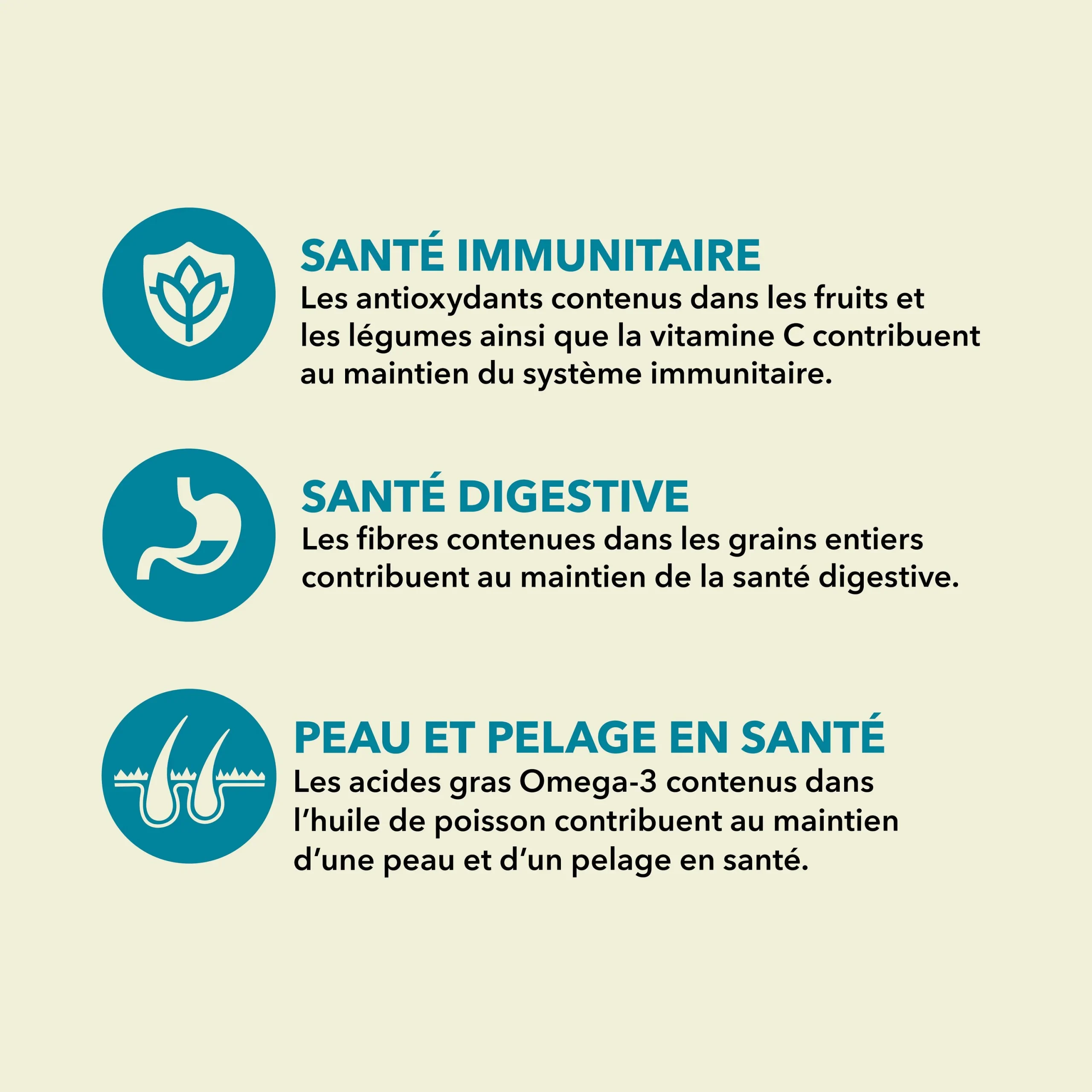 1Approximatif et déterminé à partir de l’état non transformé des ingrédients. 2Nous ajoutons aussi des vitamines et des minéraux essentiels, ainsi que des agents de conservation naturels, des probiotiques et des antioxydants.