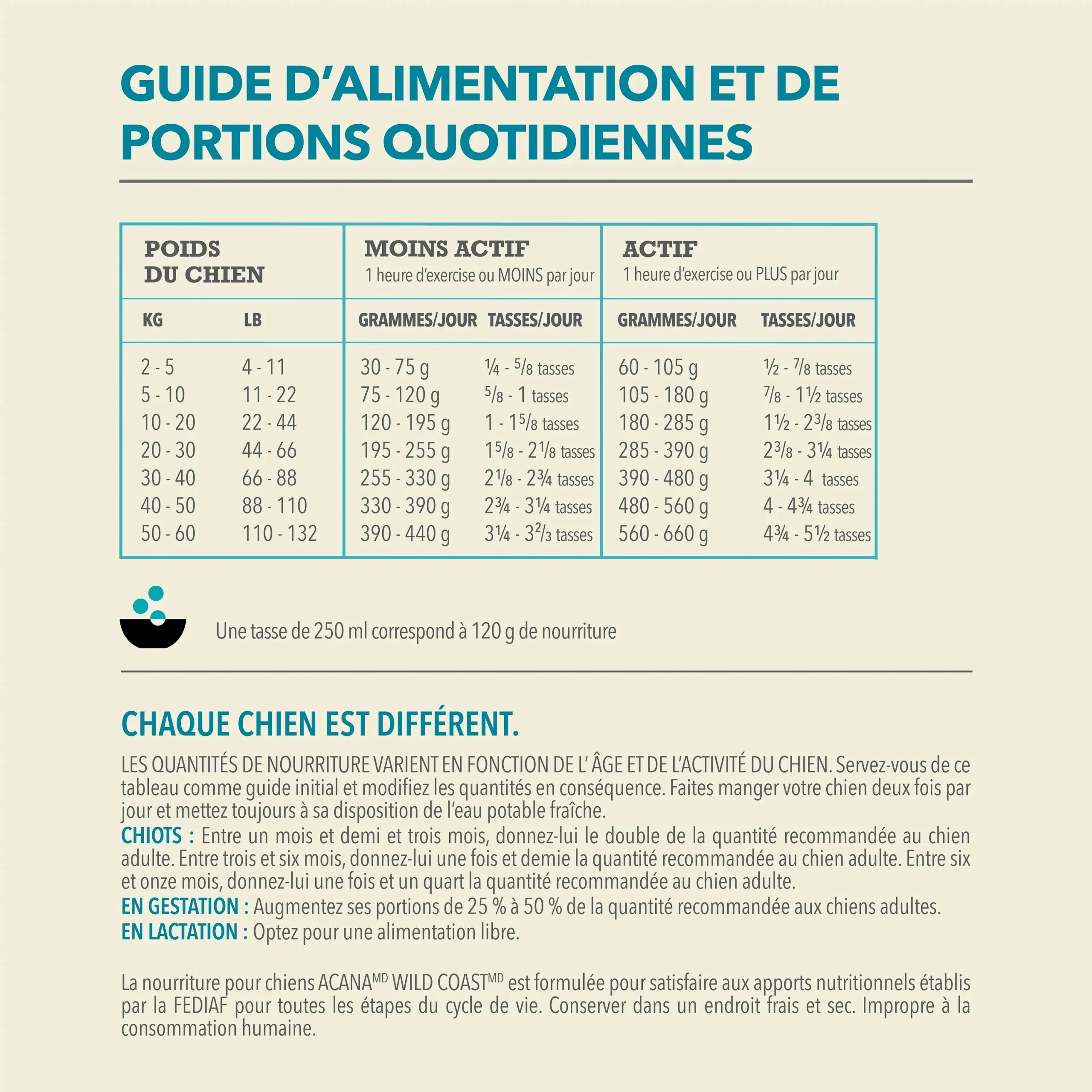 Énergie métabolisable: 3443 kcal/kg (413 kcal par tasse de 250 ml ou 120 g) avec 27% des calories provenant des protéines, 33% des glucides et 40% des matières grasses. La nourriture ACANA WILD COAST pour chiens est formulée pour satisfaire aux niveaux nutritionnels établis par la FEDIAF dans le profil des nutriments de nourritures pour chiens pour toutes les étapes du cycle de vie, y compris pour la croissance de tous les chiens de grande taille (70 lb ou plus à l’âge adulte).e).