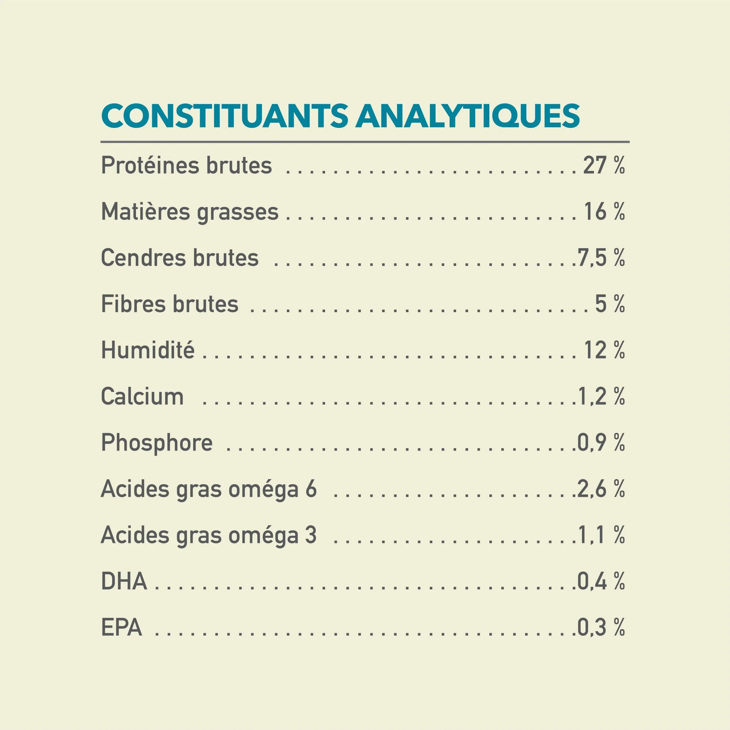 ADDITIFS (par kg) : Additifs technologiques : extraits de tocophérols issus d’huiles végétales : 110 mg; acide citrique : 40 mg. Additifs sensoriels : extrait de romarin : 75 mg. Additifs nutritionnels : chlorure de choline (choline) : 350 mg; taurine : 400 mg; protéinate de zinc : 80 mg; protéinate de cuivre : 11 mg; vitamine B1 : 100 mg; vitamine B2 : 20 mg; vitamine B3 : 200 mg; vitamine B5 : 60 mg; vitamine B6 : 35 mg; vitamine B9 : 7 mg; vitamine B12 : 0,2 mg; vitamine A : 6000 UI; vitamine D3 : 800 UI; vitamine E : 330 UI; vitamine C : 0,15 mg. Additifs zootechniques : 4b1707 Enterococcus faecium DSM 10663/ NCIMB 10415 1×10⁹ UFC.
