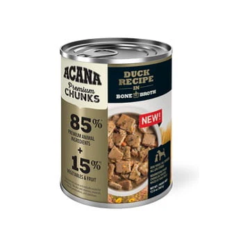 Ne vous arrêtez pas au premier ingrédient avec les recettes ACANAMD comme les Morceaux de qualité supérieure ACANA, confectionnés avec soin du début à la fin. Notre Recette au canard avec bouillon d’os est confectionnée avec 85%* d’ingrédients d’origine animale prenant la forme de morceaux de canard frais ou cru de qualité supérieure. Elle est équilibrée avec 15%*† de fruits et légumes visibles dans du bouillon d’os savoureux dont votre chien raffolera. Ajoutez-la sur les croquettes ACANA préférées de votre chien en guise de garniture humide avec un éclat de saveur, ou offrez-lui ce petit plaisir seul en guise de repas.