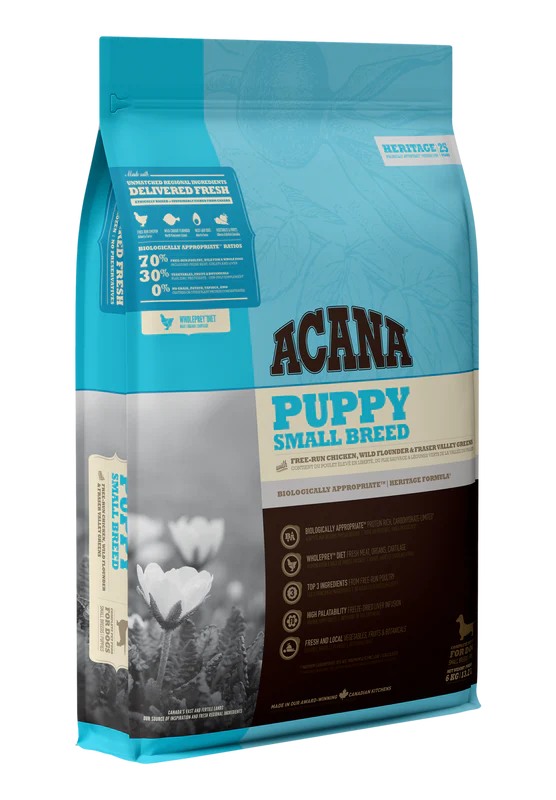 Votre chiot de petite taille grandit rapidement, nécessitant une alimentation riche en protéines et en matières grasses d’ingrédients frais et entiers pour soutenir son développement. Débordant de viande, d’organes, de cartilage et d’os de poulet en liberté et de plie sauvage, ainsi que des œufs sans cage nourrissants livrés frais ou crus dans notre cuisine par des personnes que nous connaissons et en qui nous avons confiance, ACANA Puppy Small Breed a tout pour votre chiot en pleine croissance besoins de croissance et de développement optimaux.