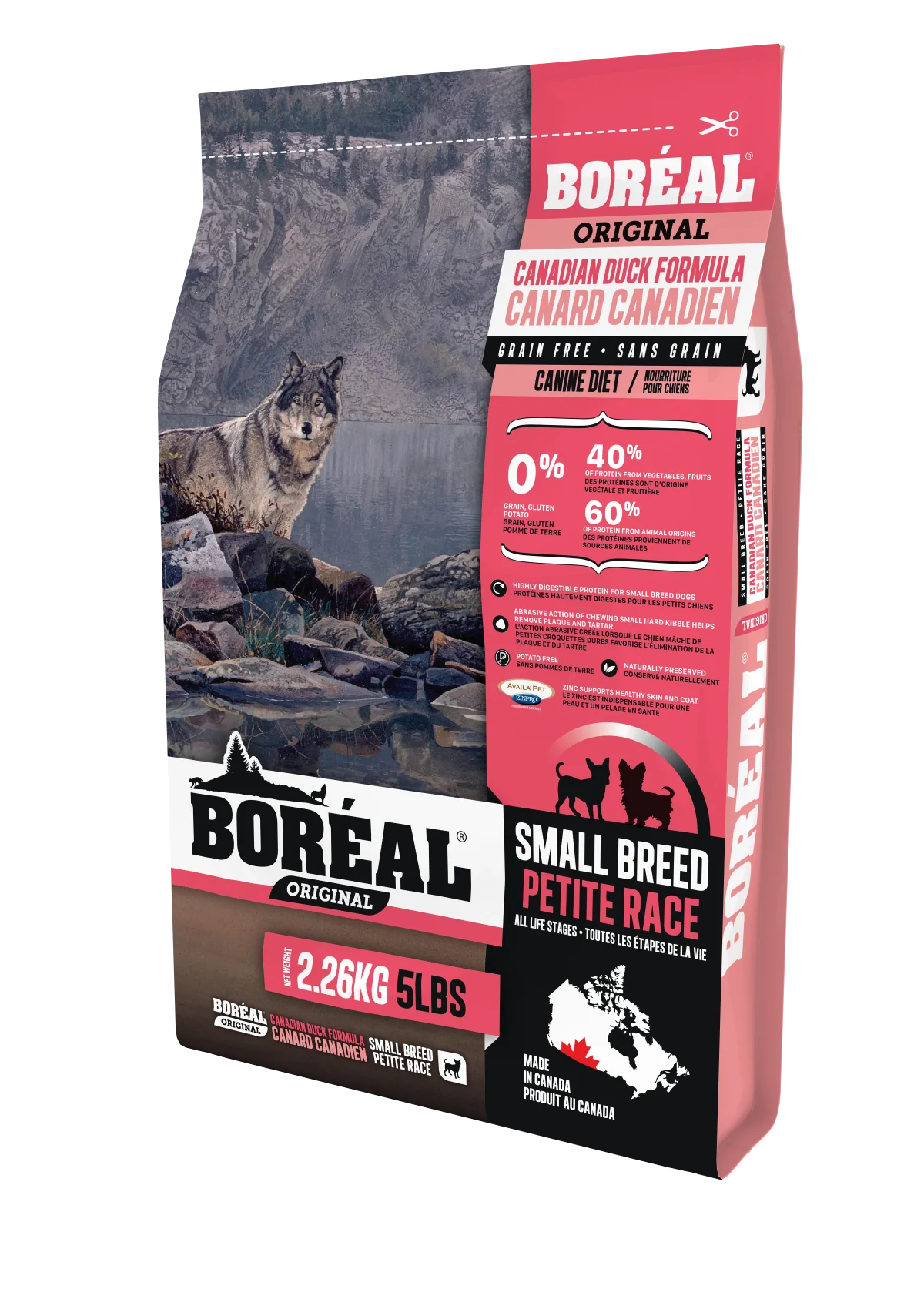 Notre régime sans céréales est conçu pour les chiens de petites races et est fait de petites croquettes de forme spécifique qui aident à éliminer le tartre et la plaque dentaire chez les chiens de petites races. Ce régime est idéal pour les chiens de petites races ayant l’estomac sensible puisqu’il est composé de canard et d’œufs entiers déshydratés facilement digestibles. C’est un régime alimentaire quotidien pouvant être utilisé afin de maintenir le poids de votre chien et pouvant également servir de préparation hypoallergénique. Nous utilisons une base de haricots et de pois pour remplacer les céréales que l’on retrouve dans plusieurs nourritures pour chiens, faisant de Boréal une nourriture faible en glucides, ayant un indice glycémique faible qui fournira un sentiment de satiété plus long au chien et qui réduira les augmentations brusques du taux de sucre dans le sang. 40 % des protéines proviennent de fruits et de légumes et 60 % des protéines proviennent de canard, d’œufs et de poisson. Nos nourritures pour chiens Boréal utilisent Availa®Pet – une collection spéciale de minéraux liés aux acides aminés pour rendre les minéraux «bio-disponibles». Le zinc organique contenu dans Availa®Pet est facilement absorbé et est beaucoup plus disponible pour un chien que les autres sources de zinc.Le zinc est essentiel pour une peau et un pelage en santé.