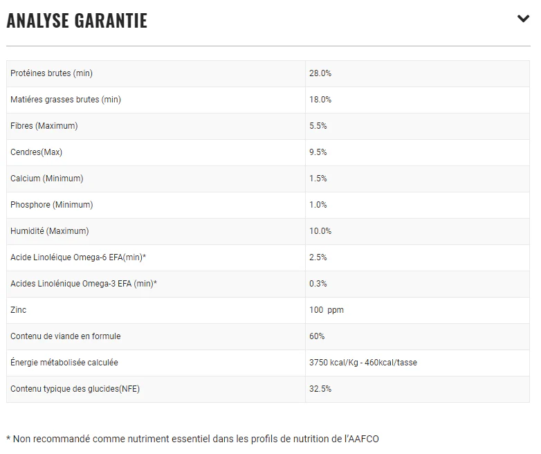 Protéines brutes (min) 28 %, matières grasses brutes (min) 15 %, fibres brutes (max) 5,5 %, humidité (max) 10 %, cendres (max) 9,5 %, calcium (min) 1,5 %, phosphore (min) 1 %, Zinc (min) 100 mg/kg, Acides gras oméga-3 (min)* 0,3 %, Acides gras oméga-6 (min)* 2,5 %