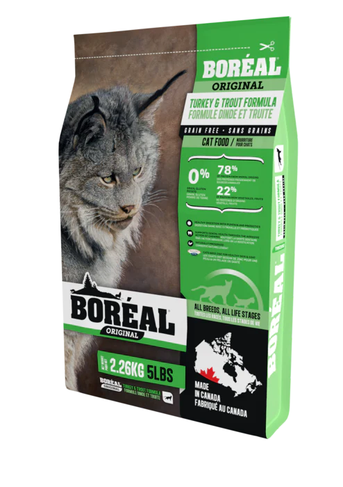 Notre régime Boréal Original formule dinde et truite est une nourriture sans céréales utilisant les protéines de poisons et dinde. C’est un régime alimentaire quotidien pouvant être utilisé afin de maintenir le poids de votre chat et pouvant également servir de préparation hypoallergénique. Nous utilisons une base de haricots et de pois pour remplacer les céréales que l’on retrouve dans plusieurs nourritures pour chats et nous y ajoutons également une combinaison de végétaux comprenant des bleuets et des canneberges, améliorant ainsi le goût de la nourriture en plus d’y ajouter des antioxydants offrant plusieurs bienfaits pour la santé. Citrouille pour la digestion. Caroube, racine de gingembre, extrait de thym et yucca pour de meilleures selles. Effet pré-biotique.