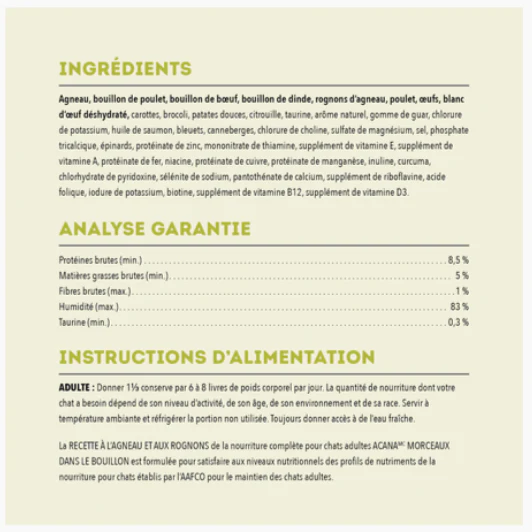 La recette à l’agneau et aux rognons de la nourriture complète pour chats adultes ACANA Morceaux dans le bouillon est formulée pour satisfaire aux niveaux nutritionnels des profils de nutriments de la nourriture pour chats établis par l’AAFCO pour le maintien des chats adultes.