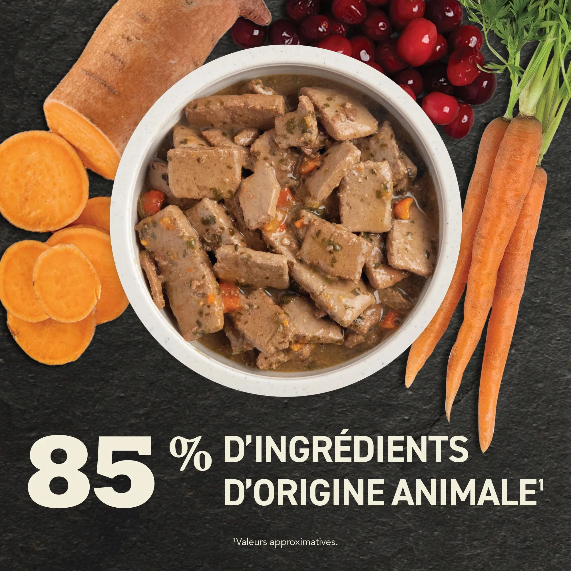 Agneau, bouillon d’agneau, bouillon d’os de bœuf, foie de bœuf, patates douces, canneberges, carottes, saumon, épinards, produit d’œuf déshydraté, arôme naturel, citrouille, gomme de guar, phosphate de sodium, chlorure de potassium, carbonate de calcium, sel, huile de tournesol, phosphate dicalcique, minéraux (protéinate de zinc, protéinate de fer, levure de sélénium, protéinate de cuivre, protéinate de cobalt, protéinate de manganèse, iodure de potassium), bleuets, vitamines (mononitrate de thiamine, supplément de vitamine E, niacine, pantothénate de calcium, supplément de riboflavine, supplément de vitamine A, supplément de vitamine B12, chlorhydrate de pyridoxine, biotine, acide folique, supplément de vitamine D3), chlorure de choline, taurine, huile de poisson.
