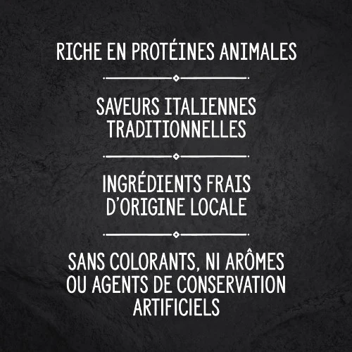 Faites avec amour et des ingrédients locaux de qualité, nos pâtés haut de gamme contiennent une remarquable teneur à 95 % en viande et en volaille fraîches. Réjouissez-vous des saveurs riches de l’Italie avec des ingrédients de sources locales soigneusement choisies afin de reproduire un authentique repas italien.