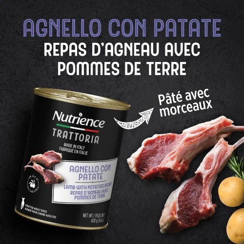 Faites l’expérience du vrai goût de l’Italie à chaque bouchée en régalant votre chien de la nourriture Nutrience Trattoria, repas d’agneau avec pommes de terre et en le laissant savourer chaque arôme de l’amore!