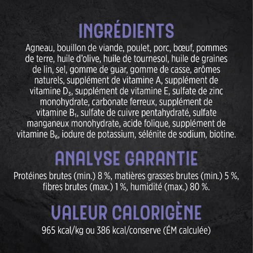 Agneau, bouillon de viande, poulet, porc, bœuf, pommes de terre, huile d’olive, huile de tournesol, huile de graines de lin, sel, gomme de guar, gomme de casse, arômes naturels, supplément de vitamine A, supplément de vitamine D3, supplément de vitamine E, sulfate de zinc monohydrate, carbonate ferreux, supplément de vitamine B1, sulfate de cuivre pentahydraté, sulfate manganeux monohydrate, acide folique, supplément de vitamine B6, iodure de potassium, sélénite de sodium, biotine.