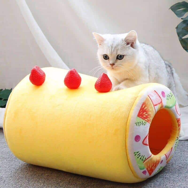 Ce coussin en forme de tarte aux fruits pour chat attire l’attention grâce à son design unique et à ses belles couleurs. Certainement, le petit félin sera attiré par ce coussin. De plus, ce coussin fournit un abri chaud et confortable à votre chat durant l’hiver. Votre chat peut aussi s’amuser avec les fruits en peluche placés sur le dessus de ce coussin.