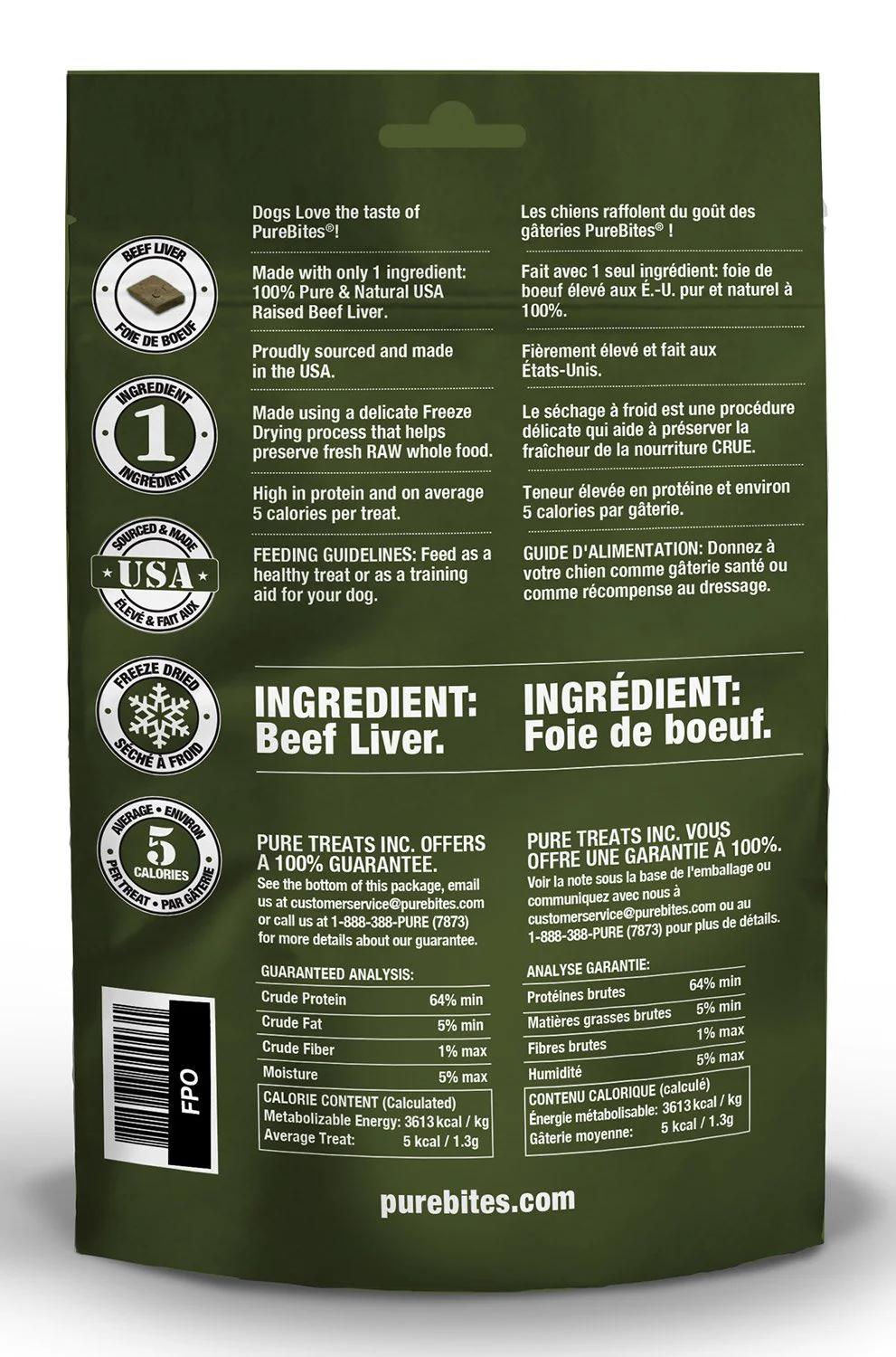 Allez-y, retournez le sac et regardez les ingrédients. Les Gâteries PureBites® sont faites avec 1 seul ingrédient; du foie de boeuf inspecté USDA pur et naturel à 100% des États-Unis.