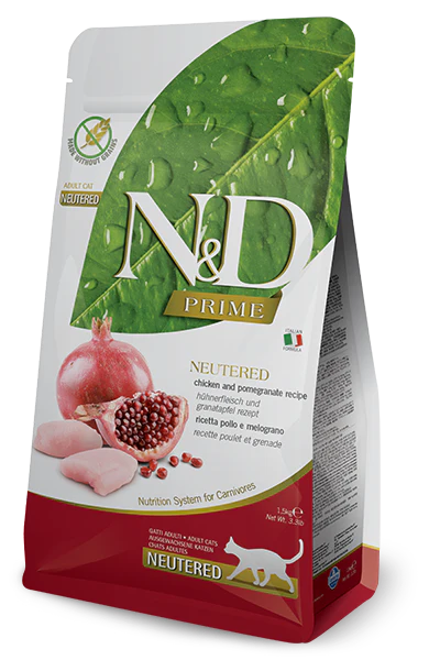 N&D Neutered Chicken and pomegranate recipe is formulated to meet the nutritional levels established by the AAFCO Cat Food Nutrient Profiles for maintenance.