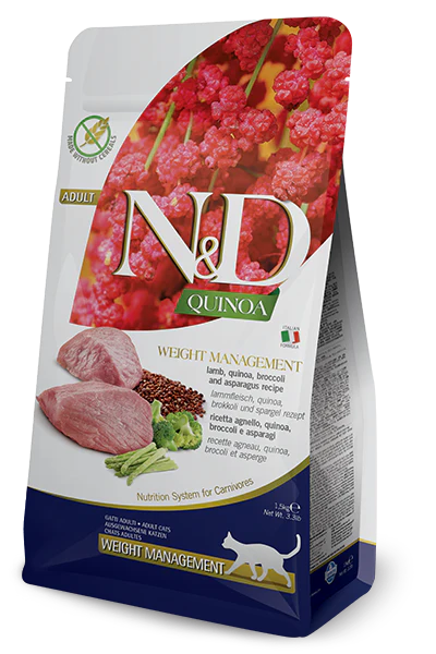 N&D Quinoa Weight Management est une alimentation diététique complète pour chats, recommandée pour la réduction d’un excès pondéral.
