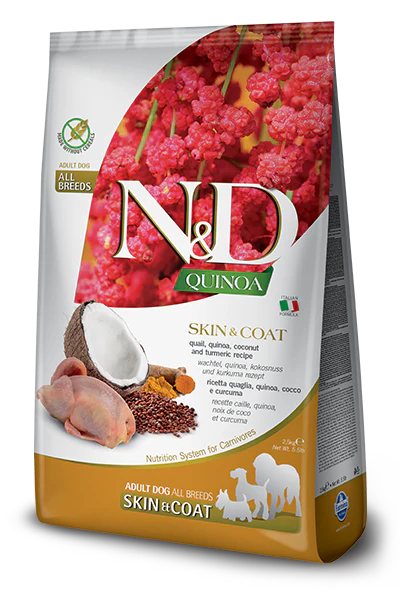 caille, caille déshydratée, amidon de pois, huile de hareng, graine de quinoa, graines de lin, noix de coco séchée, curcuma, inuline, fructooligosaccharide, extrait de levure, carbonate de calcium, phosphate bicalcique, enveloppe de graine de psyllium, chlorure de potassium, sel, levure séchée de brasserie, chlorhydrate de glucosamine, sulfate de chondroïtine, supplément de vitamine A, supplément de vitamine D3, supplément de vitamine E, acide ascorbique, niacine, pantothénate de calcium, riboflavine, chlorhydrate de pyridoxine, mononitrate de thiamine, biotine, acide folique, supplément de vitamine B12, chlorure de choline, bêta-carotène, zinc méthionine hydroxy chélate d’analogue, chélate d’analogue d’hydroxy de manganèse méthionine, glycine ferreuse, chélate d’analogue d’hydroxy de méthionine de cuivre, levure de sélénium, DL-méthionine, taurine, L-carnitine, gel concentré d’aloe vera, extrait de thé vert, extrait de romarin, tocophérols mixtes (un conservateur).