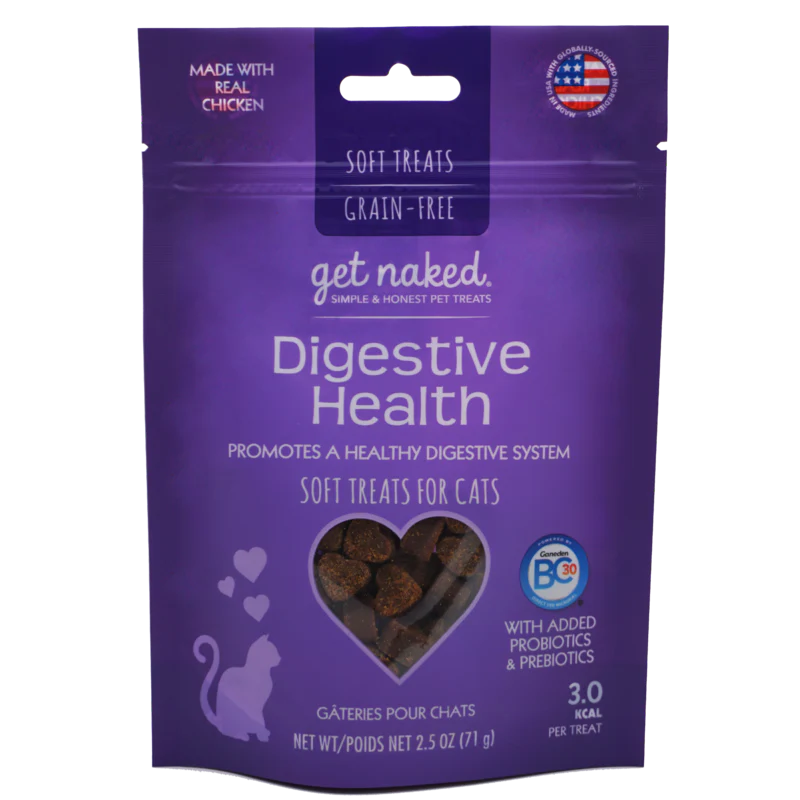 Les friandises Santé Digestive de Get Naked® pour chats sont formulées avec des fibres alimentaires naturelles, des huiles végétales et fortifiées avec des probiotiques pour favoriser un système digestif sain.