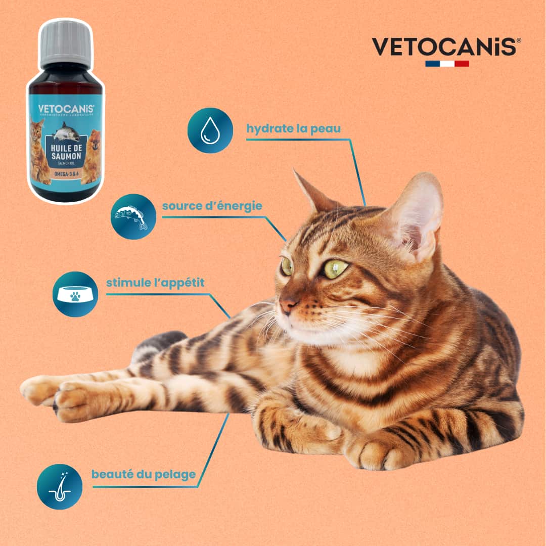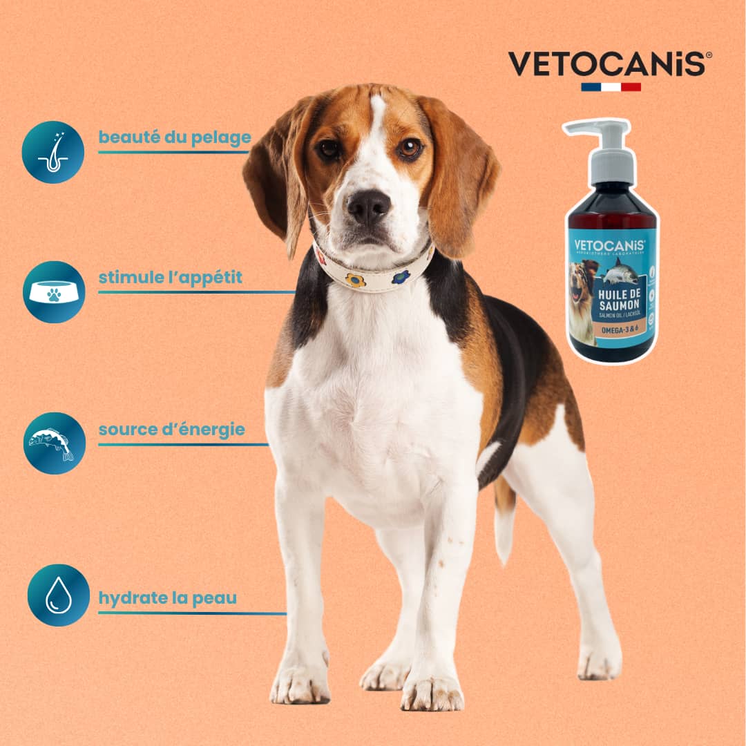 L’huile de saumon Vetocanis est un aliment complémentaire pour chiens et chats spécialement conçu pour améliorer la beauté du pelage des chiens et des chats de tout âge. Elle augmente l’appétence de la nourriture tout en étant une excellente source d’énergie (oméga 3 & 6).
