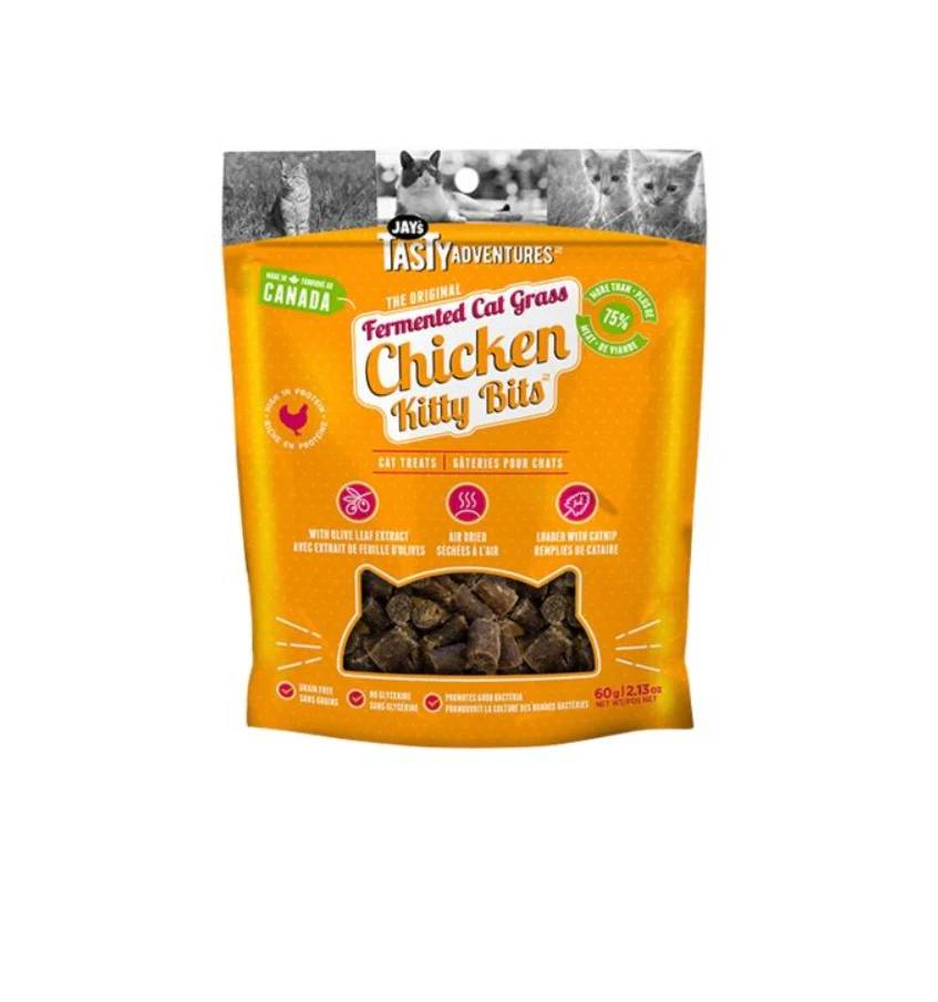 - Les Kitty Bits de Jay’s sont des gâteries fermentées pour chat et qui sont infusées d’herbe à chat et d’extrait de feuille d’olive pour renforcer la santé.