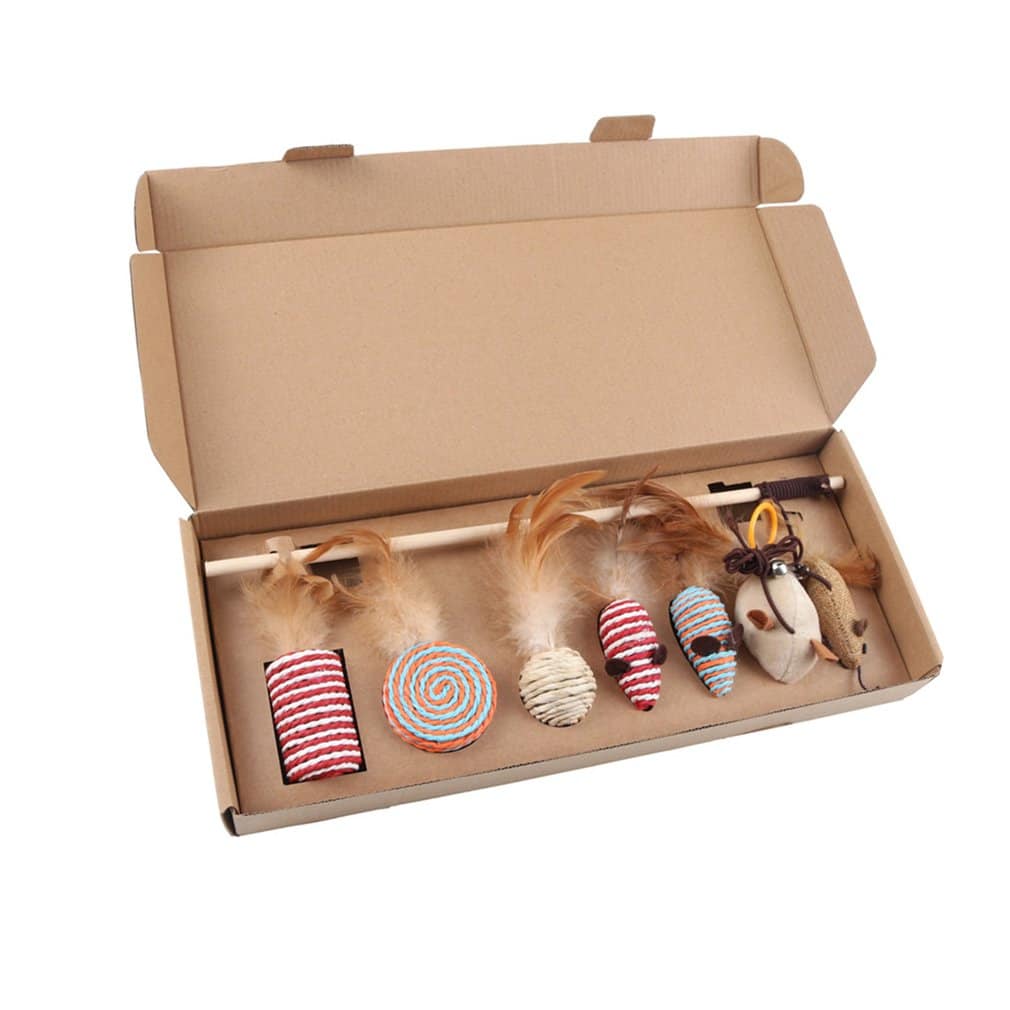 Les matous s’ennuient vite, n’est-ce pas? C’est pourquoi nous vous proposons un ensemble de jeux à souris en plumes 7 pièces pour chat. Les couleurs vives et les plumes attachées aux queues des souris seront une vraie source d’excitation pour vos félins. En plus, vous recevrez également une grande perche en bois pour chat avec laquelle vous pourrez pousser et lancer les souris à distance et amuser votre chat.