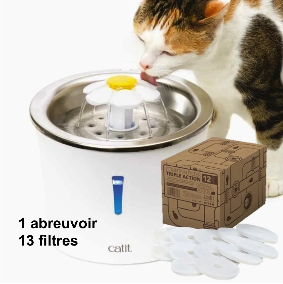 S’utilisent exclusivement avec les filtres à triple action Catit. En effet, les autres filtres sont moins efficaces et peuvent même endommager votre abreuvoir avec fleur et veilleuse à DEL. Rincer le filtre à fond et le submerger dans l’eau pendant 10 minutes avant de l’utiliser.