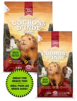 Cette formule est recommandée pour les jeunes cochons d’Inde et les cochons d’Inde actifs ou en croissance. Pour les cochons d’Inde plus âgés et moins actifs, nous recommandons la nourriture pour cochons d’Inde adultes Timothy little friendsMC. La nourriture pour cochons d’Inde Formule originale little friendsMC est une nourriture entièrement végétarienne, faite avec du foin de luzerne. Elle est enrichie de vitamine C stabilisée et contient de l’extrait de yucca pour aider à contrôler les odeurs.