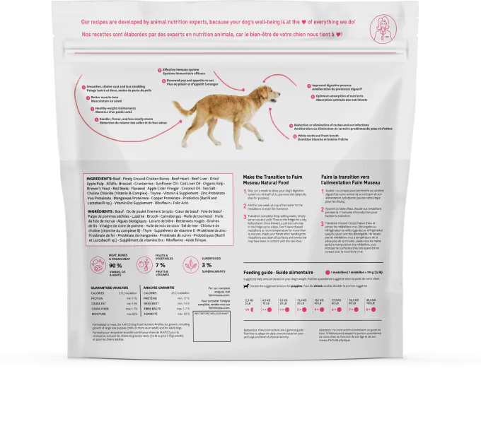 Bœuf, Os de poulet finement broyés, Cœur de bœuf, Foie de poulet, Pulpe de pomme, Luzerne, Brocoli, Canneberges, Huile de tournesol, Huile de foie de morue, Levure de bière, Algues biologiques, Vinaigre de cidre de pomme, Huile de noix de coco, Graines de lin, Sel de mer, Betteraves rouges, Chlorure de choline (vitamine du complexe B), Thym, Supplément de vitamine E, Protéinate de zinc, Protéinate de fer, Protéinate de manganèse.