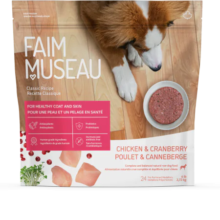 Parmi les premières développées par Faim Museau, cette recette est un classique adoré des chiens. Son secret? Sa délicieuse combinaison de poulet et de canneberges, un fruit réputé pour prévenir les problèmes urinaires et la formation de plaque dentaire chez les chiens.
