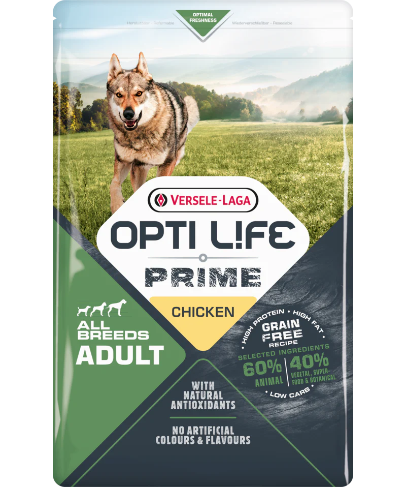 Avec Opti Life Prime Adult Chicken vous servez à votre chien un repas premium, riche, délicieux et débordant de nutriments puissants. Notre recette sans céréales est riche en protéines et en graisses, et pauvre en glucides, avec le mélange idéal d’ingrédients de la plus haute qualité, les plus savoureux et les plus naturels pour une journée pleine d’aventures.