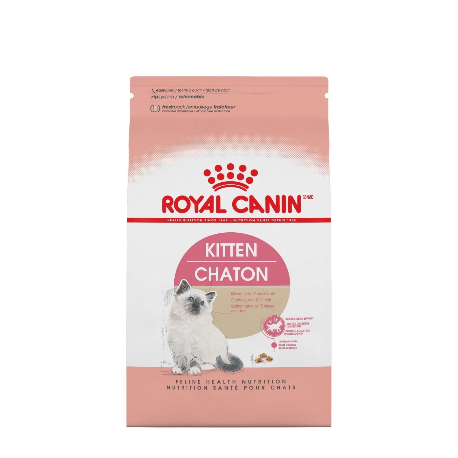La croissance est une phase critique dans la vie d’un chaton : c’est le moment des grands changements, des découvertes et des nouvelles rencontres. Pendant cette période clé, le système immunitaire du chaton se développe graduellement. Le complexe exclusif d’antioxydants (vitamines C et E, lutéine et taurine) et les prébiotiques (MOS*) contenus dans la formule CHATON de Royal Canin aident à renforcer les défenses naturelles du chaton.