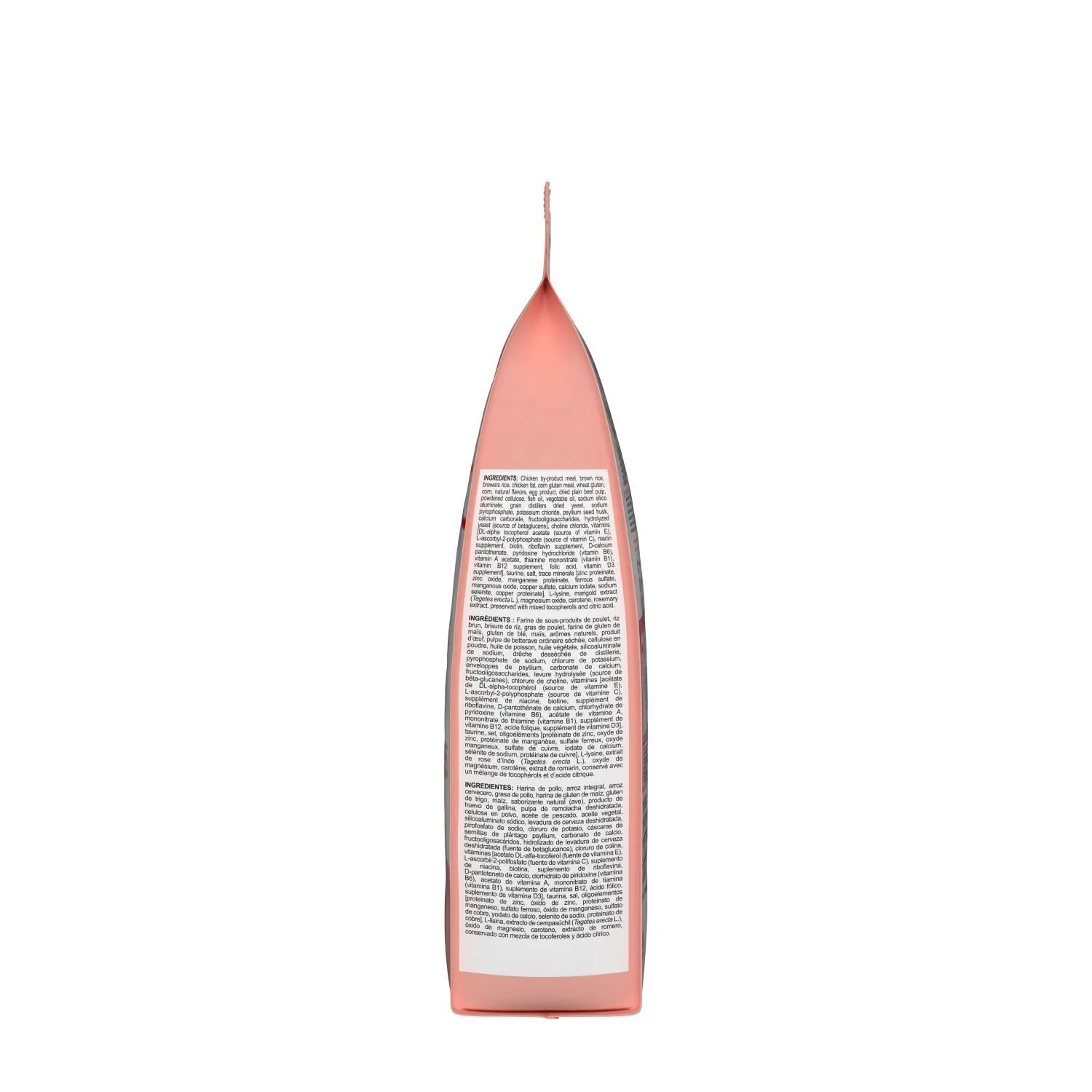 Farine de sous-produits de poulet, riz brun, farine de gluten de maïs, brisure de riz, gras de poulet, gluten de blé, maïs, arômes naturels, produit d’œuf, pulpe de betterave ordinaire séchée, cellulose en poudre, huile de poisson, phosphate monocalcique, carbonate de calcium, drêche desséchée de distillerie, huile végétale, silicoaluminate de sodium, chlorure de potassium, enveloppes de psyllium, fructooligosaccharides, sel, chlorure de choline, vitamines [acétate de DL-alpha-tocophérol (source de vitamine E), L-ascorbyl-2-polyphosphate (source de vitamine C), supplément de niacine, biotine, supplément de riboflavine, D-pantothénate de calcium, chlorhydrate de pyridoxine (vitamine B6), acétate de vitamine A, mononitrate de thiamine (vitamine B1), supplément de vitamine B12, acide folique, supplément de vitamine D3], L-lysine, pyrophosphate de sodium, levure hydrolysée, DL-méthionine, taurine, oligoéléments [protéinate de zinc, oxyde de zinc, sulfate ferreux, protéinate de manganèse, oxyde manganeux, sulfate de cuivre, iodate de calcium, protéinate de cuivre, sélénite de sodium], extrait de rose d’Inde (Tagetes erecta L.), oxyde de magnésium, extrait de romarin, conservé avec un mélange de tocophérols et d’acide citrique.