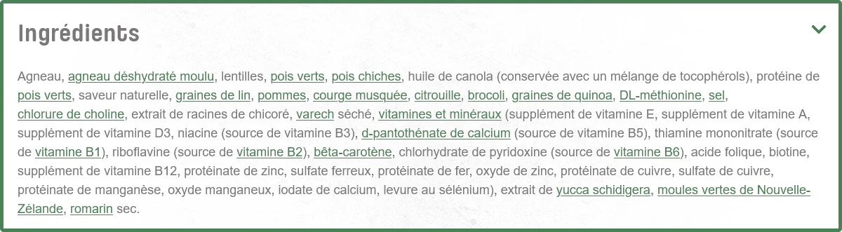 Ils ont ajouté de la vraie viande d’agneau, une source de protéines faciles à digérer, ainsi que de la citrouille, riche en fibres naturelles, pour créer un milieu optimal favorisant la digestion. Mieux encore, les combinaisons optimales de Nutram, « Optimum CombinationsMC », renferment des acides gras oméga-3 un anti-inflammatoires provenant d’aliments complets comme des graines de lin et des moules vertes, pour améliorer la mobilité des articulations. Vous pouvez avoir la certitude que la nourriture de votre animal est saine et bénéfique, et qu’elle contribue à son mieux-être général.