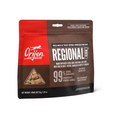 Offrez à votre chat des gâteries lyophilisées ORIJENMD délicieuses et nutritives. Riche en protéines animales, notre recette Regional RedMD est composée à 99 % d’ingrédients d’origine animale, dont du foie de bœuf, de la chèvre, du sanglier et de l’agneau. Lyophilisées pour préserver la richesse de leurs nutriments et de leur goût, elles sont faciles à emporter et parfaites pour l’aventure. Contenant seulement six calories chacune, les gâteries lyophilisées ORIJEN débordent de protéines et d’une saveur incroyable.