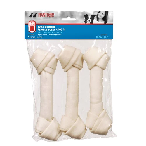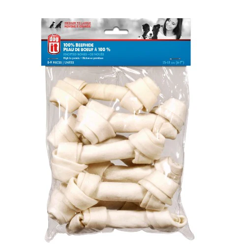 Les os noué Dogit en peau de bœuf répondent au besoin incessant de mâcher des chiens. Ceux-ci en tirent avantage, car en les mâchonnant, leurs gencives sont renforcées, leurs dents nettoyées et leur santé dentaire améliorée.