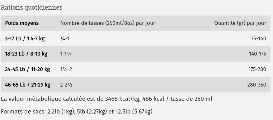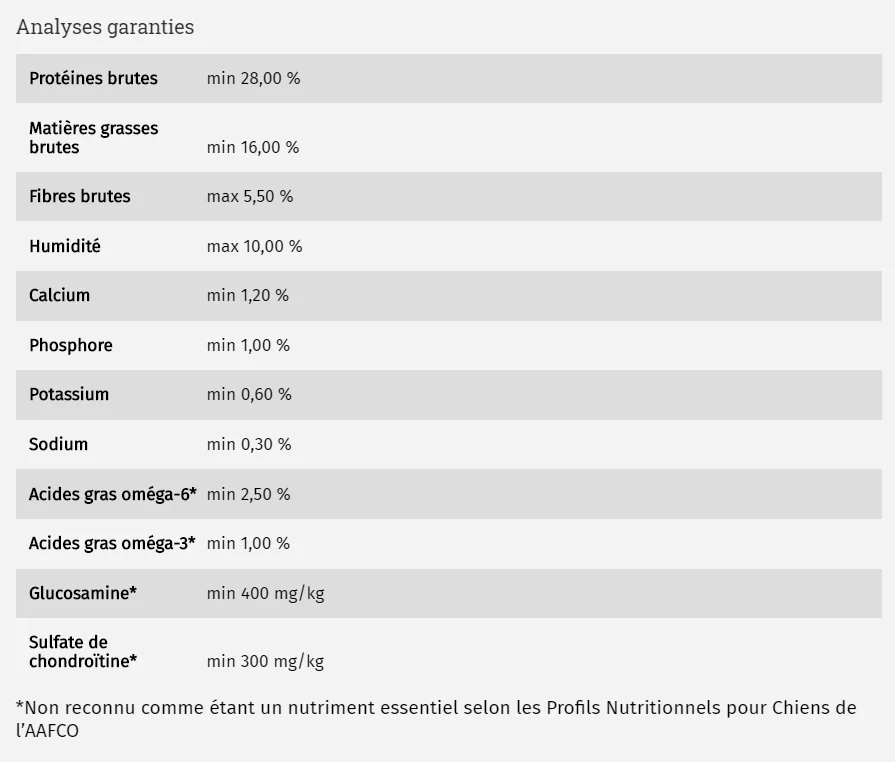 Canard, Tapioca, Farine de canard, Farine de poisson, Pois entiers, Protéine de pois, Pois chiches entiers, Huile de canola (conservée avec un mélange de tocophérols et d’acide citrique), Fibre de pois, Lentilles vertes, Graines de lin entières moulues, Phosphate dicalcique, Sel de mer, Saveur naturelle, Chlorure de potassium, Chlorure de choline, Inuline (prébiotique), Protéinate de zinc, Protéinate de fer, Chlorhydrate de glucosamine, Extrait de Yucca schidigera, Sulfate de chondroïtine, Supplément de vitamine E, Protéinate de cuivre, Protéinate de manganèse, Supplément de niacine, Acétate de vitamine A, D-pantothénate de calcium, Supplément de riboflavine, Mononitrate de thiamine, Supplément de vitamine D3, Supplément de vitamine B12, Hydrochlorure de pyridoxine, Iodate de calcium, Acide folique, Sélénite de sodium, Extrait de romarin. Peut contenir des traces d’arachides.