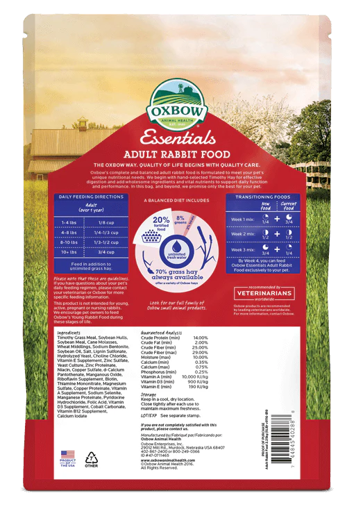 Les aliments Oxbow’s Essentials – Adult Rabbit sont conçus pour répondre aux besoins nutritionnels spécifiques des lapins adultes et les aider à prospérer. Cette nourriture complète et équilibrée pour lapin adulte contient du foin Timothy pour une digestion saine, ainsi que tous les ingrédients sains et les nutriments essentiels nécessaires au maintien de la performance et des fonctions quotidiennes.