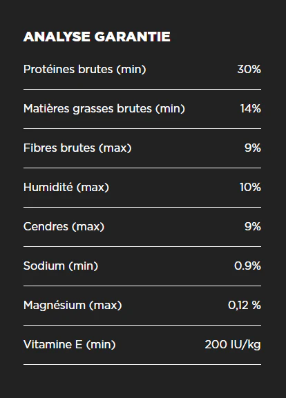 Poulet désossé, riz blanc, farine d’avoine, poulet déshydraté, herbe à éléphant moulue, pois, poudre d’œuf entier, gras de poulet (préservé avec un mélange de tocophérols), farine de saumon, saveur naturelle, sel, enveloppe de psyllium, acide phosphorique, carbonate de calcium, chlorure de potassium, DL-méthionine, bisulfate de sodium, saumon désossé, chlorure de choline, huile de microalgues marines, racine de chicorée, taurine, L-tryptophan, vitamines (supplément de vitamine E, niacine, mononitrate de thiamine, supplément de vitamine A, biotine, pantothénate de calcium, bêta-carotène, riboflavine, chlorhydrate de pyridoxine, supplément de vitamine B12, acide folique, supplément de vitamine D3), minéraux (protéinate de zinc, sulfate de fer, oxyde de zinc, protéinate de fer, sulfate de cuivre, protéinate de cuivre, protéinate de manganèse, oxyde manganeux, sélénite de sodium, iodate de calcium), canneberges, L-lysine, extrait de yucca schidigera, romarin séché.