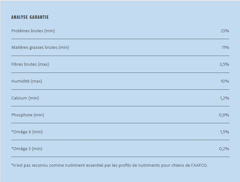 farine de poulet, farine d’avoine, seigle, orge, avoine entière, gras de poulet (préservé avec un mélange de tocophérols), saveur naturelle, farine de saumon, graines de lin, sel, chlorure de potassium, citrouille, courges, patates douces, luzerne séchée au soleil, carottes, lentilles, brocoli, bleuets, grenades, bananes, canneberges, vitamines (supplément de vitamine E, L-ascorbyl-2-polyphosphate (une source de vitamine C), niacine, pantothénate de calcium, supplément de vitamine A, mononitrate de thiamine, riboflavine, bêta-carotène, supplément de vitamine B12, biotine, chlorhydrate de pyridoxine, supplément de vitamine D3, acide folique), minéraux (sulfate de fer, protéinate de zinc, protéinate de fer, levure de sélénium, oxyde de zinc, sulfate de cuivre, protéinate de manganèse, protéinate de cuivre, oxyde manganeux, iodate de calcium), taurine, DL-méthionine, L-lysine, chlorure de choline, romarin séché