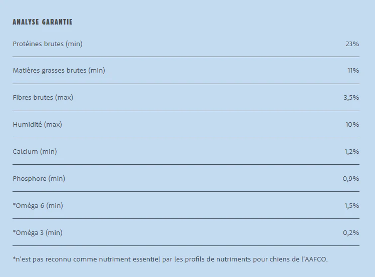 farine de poulet, farine d’avoine, seigle, orge, avoine entière, gras de poulet (préservé avec un mélange de tocophérols), farine de dinde, saveur naturelle, graines de lin, sel, chlorure de potassium, citrouille, courges, patates douces, luzerne séchée au soleil, carottes, lentilles, brocoli, bleuets, grenades, bananes, canneberges, vitamines (supplément de vitamine E, L-ascorbyl-2-polyphosphate (une source de vitamine C), niacine, pantothénate de calcium, supplément de vitamine A, mononitrate de thiamine, riboflavine, bêta-carotène, supplément de vitamine B12, biotine, chlorhydrate de pyridoxine, supplément de vitamine D3, acide folique), minéraux (sulfate de fer, protéinate de zinc, protéinate de fer, levure de sélénium, oxyde de zinc, sulfate de cuivre, protéinate de manganèse, protéinate de cuivre, oxyde manganeux, iodate de calcium), taurine, DL-méthionine, L-lysine, chlorure de choline, romarin séché