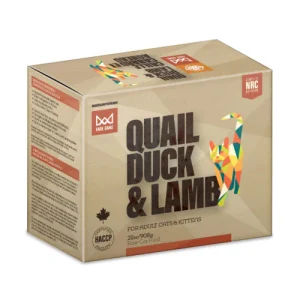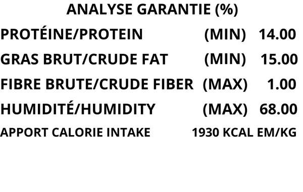 Poulet avec os finement broyés, Bœuf, Abats de porc, Foie de bœuf, Œufs*, Courge, Graines de lin moulues, Varech*, Huile de canola, Huile de poisson, Levure de bière, Pro-mix (Sel, Chlorure de choline, Taurine, Protéinate de zinc, Protéinate de manganèse, Protéinate de fer, Protéinate de cuivre, Supplément de Vitamine A, Vitamine E, Biotin, Acide folique, Thiamine Mononitrate, Vitamine D3 (Cholecalciférol)