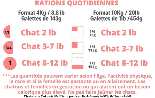Les quantité peuvent varier selon l’âge, l’activité physique, la race et si la femelle est gestante ou en allaitement. Les chatons et femelles en gestation ou qui allaitent ont un besoin calorique plus élevé. Ne pas faire jeûner les chats