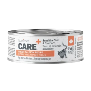 Eau en quantité suffisante pour le traitement, sous-produits de porc, sous-produits de poulet, foie de poulet, foie de porc, saumon, farine de blé, gluten de blé, gélatine, plasma de porc, cellulose en poudre, arômes naturels, amidon de maïs modifié, sulfate de calcium, gomme de guar, chlorure de potassium, tripolyphosphate de sodium, carraghénine, taurine, vitamines [acétate de DL-alpha-tocophérol (source de vitamine E), mononitrate de thiamine (vitamine B1), supplément de niacine, biotine, D-pantothénate de calcium, chlorhydrate de pyridoxine (vitamine B6), supplément de riboflavine, acide folique, supplément de vitamine B12, supplément de vitamine D3], oligoéléments [protéinate de zinc, oxyde de zinc, sulfate ferreux, sulfate de cuivre, oxyde manganeux, sélénite de sodium, iodate de calcium], chlorure de choline.