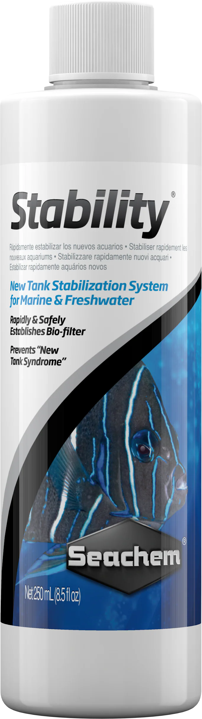 Stability® établira rapidement et en toute sécurité le biofiltre d’aquarium dans les systèmes d’eau douce et marins, prévenant ainsi la cause n ° 1 de la mort des poissons: le « syndrome du nouveau réservoir ». Stability® est spécialement formulé pour l’aquarium et contient un mélange synergique de bactéries aérobies, anaérobies et facultatives facilitant la décomposition des déchets organiques, de l’ammoniac, des nitrites et des nitrates. Les bactéries utilisées par Stability® ne fixent pas le soufre et ne produiront pas d’hydrogène sulfuré toxique. Stability® est totalement inoffensif pour tous les organismes aquatiques, ainsi que pour les plantes aquatiques. Il n’y a donc aucun danger d’utilisation excessive.