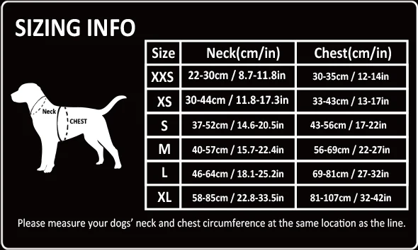 Avant de commander, pensez à bien mesurer le tour de poitrine et de cou de votre chien. Les mesures étant effectuées manuellement, il est possible qu’il y ait une erreur de 1 à 3cm.