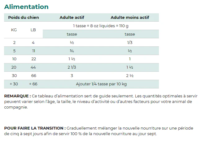 Dinde désossée, haricots blancs, pois, œuf séché entier, orge perlé, huile de canola (conservé avec un mélange de tocophérols), lapin désossé, millet perlé, graines de lin, phosphate dicalcique, saveur naturelle, carbonate de calcium, quinoa, sel, vitamines (chlorure de choline, supplément de vitamine E, L-ascorbyl-2-polyphosphate [source de vitamine C], niacine, bêta-carotène, d-pantothénate de calcium, supplément de vitamine A, riboflavine, supplément de vitamine B12, mononitrate de thiamine, chlorhydrate de pyridoxine, supplément de vitamine D3, acide folique), minéraux (sulfate de zinc, sulfate ferreux, sulfate de cuivre, sulfate de manganèse, sélénite de sodium, iodate de calcium, protéinate de zinc, protéinate de cuivre, protéinate de manganèse, protéinate de fer), racine de chicorée séchée, extrait de levure, tripolyphosphate de sodium, pommes, carottes, canneberges, épinards, patates douces, orge au stade de graminée, tomates, produit de fermentation séché Bacillus subtilis, produit de fermentation séché Bacillus licheniformis, produit de fermentation séché Lactobacillus acidophilus, produit de fermentation séché Lactobacillus casei, produit de fermentation séché Bifidobacterium bifidum, produit de fermentation séché Enterococcus faecium, produit de fermentation séché Aspergillus oryzae.