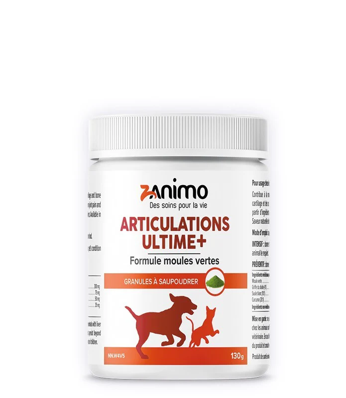 Ultime+ avec moule verte contribue à la mobilité et à la souplesse des hanches et des articulations. Elle supporte la santé du cartilage et des os, favorise la flexibilité et maintient le confort articulaire. Sa recette unique est l’une des meilleures options à donner à son animal qui souffre de douleurs articulaires et de raideurs au lever. Elle contient une synergie de 4 ingrédients actifs et efficaces qui ont démontré des résultats visibles en 10 jours. Contient 3 anti-inflammatoires naturels.
